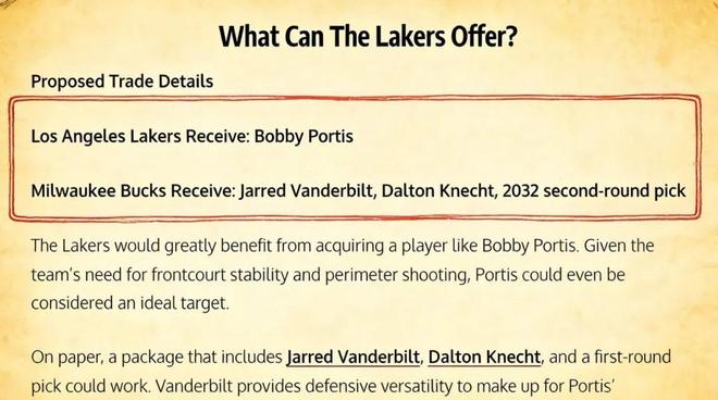 美媒《Fadeaway World》撰文建议,湖人应该打包送出范德比尔特、克内克特以及2032年的首轮签,从雄鹿引入波蒂斯。