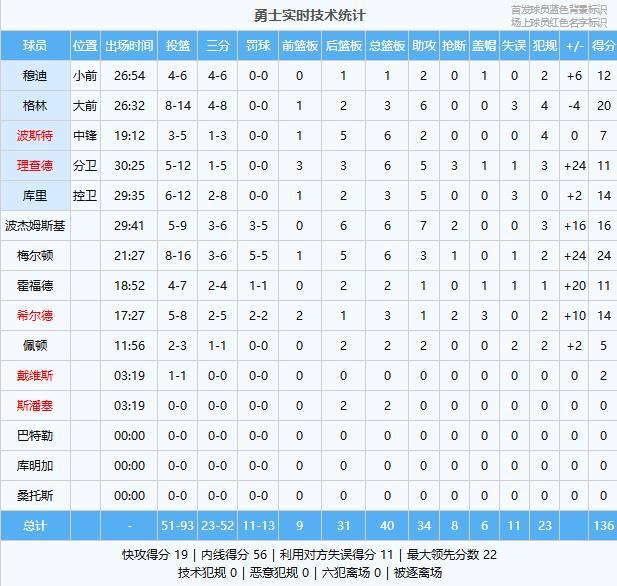 梅尔顿24分6板3助、格林20分3板6助、波杰姆斯基16分6板7助2断、库里14分3板5助、希尔德14分3板1助2断3帽、穆迪12分1板2助、理查德11分6板5助3断、霍福德11分2板1助