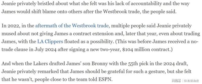 其四,2021年7月那笔拉塞尔·威斯布鲁克的交易,成为了珍妮·巴斯与詹姆斯关系恶化的重要转折点。当时,球队为了迎合詹姆斯的意愿推动了这笔交易,然而结果却是一场灾难。湖人在该赛季仅取得33胜49负的战绩,无缘季后赛。更让珍妮·巴斯不满的是,詹姆斯似乎试图撇清自己在推动这笔交易中的角色,缺乏应有的担当。据知情人士透露,珍妮·巴斯私下对詹姆斯这种“缺乏担当”以及在威少交易后“将责任推给他人”的做法极为不满。
