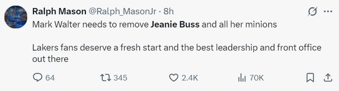 美媒认为新老板马克-沃尔特在购买了湖人队后应该将珍妮-巴斯以及她的手下全部清除,湖人球迷需要一个全新的开始,球队也需要更出色的管理层与教练组。