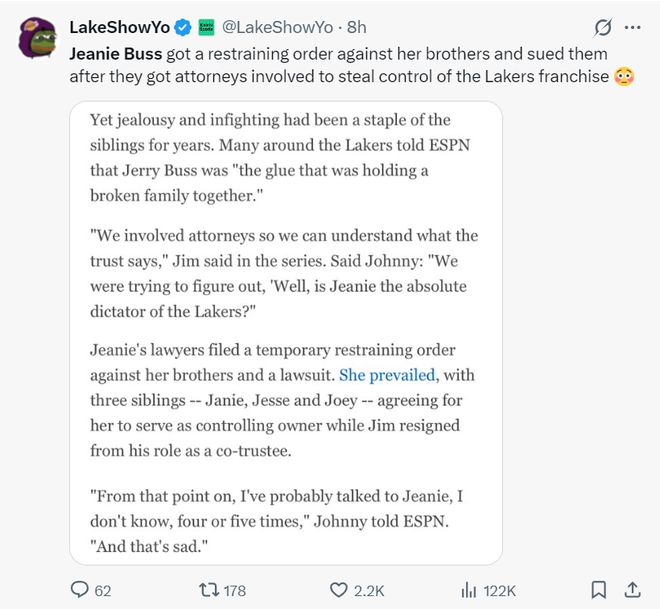 但巴斯家族的内斗的确存在,珍妮向她的兄弟们申请了限制令并将他们都告上法庭,原因是他的兄弟们试图让律师介入夺取湖人队的控制权。