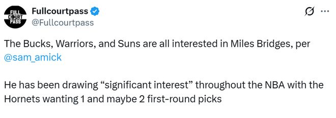 北京时间1月23日,随着交易截止日日益临近,黄蜂队前锋迈尔斯-布里奇斯已引发多支球队的强烈交易兴趣。据名记萨姆-阿米克报道,勇士、雄鹿和太阳均在追逐这位27岁球员的球队之列。