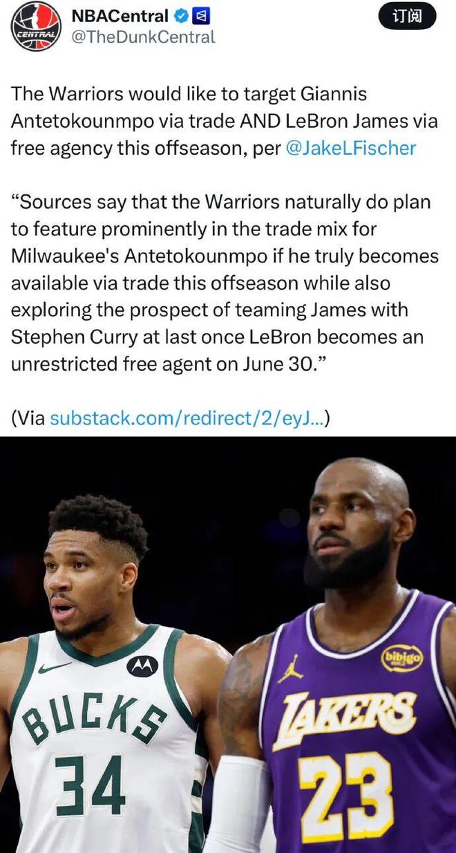 名记Fischer:勇士计划今年夏天交易来字母哥,并在自由市场签下詹姆斯......
