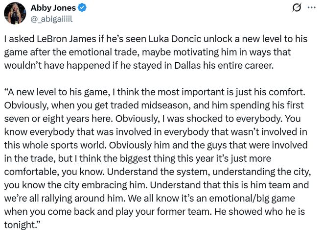 湖人队另外一名核心詹姆斯也对东契奇的表现给予认可:“他的比赛进入到了全新的层次,这与他的适应程度有关,他在达拉斯度过了7、8年时间,然后在赛季中期被交易,对于任何人来说都是一个震惊的消息。”