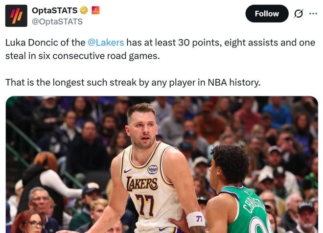 凭借这样的表现,东契奇已经连续6个客场至少轰下30分8助1抢断,创造历史NBA最长纪录。