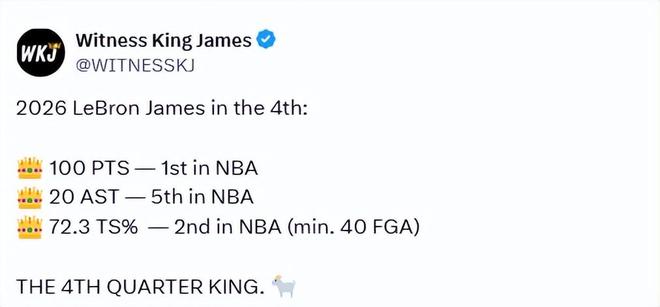 随后,美媒也晒出了詹姆斯进入2026年后的第四节数据——