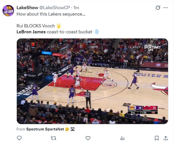 都知道对阵独行侠一战,勒布朗是在末节才发力(11+3+2+1+1)帮助湖人完成14分的大逆转,可这场比赛41岁的勒布朗首节就进入了进攻模式,首节老詹8分钟里6中4拿到8分2篮板1抢断,美中不足就是完成2+1后那个加罚没进,进入三秒区的4次出手都命中。