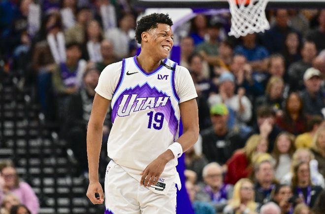 半场数据,爵士这边,5号秀贝利表现不错,投篮8中5,三分球5中3,拿到13分1盖帽。