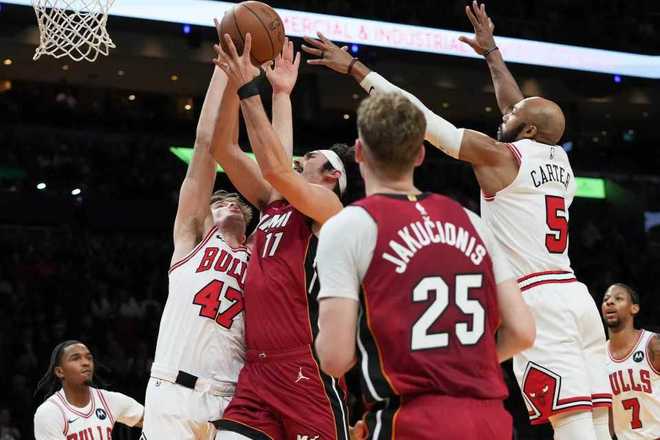 热火上一场客场116-113险胜公牛,公牛过去3场连输湖人、步行者与热火遭遇3连败,本赛季前两次交锋热火均客场战胜公牛。本场热火缺少鲍威尔、希罗、米切尔与罗齐尔,公牛缺少吉迪、怀特、武切维奇等。首节前4分半钟热火3-12落后,热火连追5分,公牛连得4分。热火持续反扑追到17-20落后,卡特三分命中,维金斯三分回敬,公牛内外开花扩大9分优势。热火再追3分,首节结束热火25-31落后公牛。首节公牛24中12,其中三分11中4,热火26中9,其中三分12中3。
