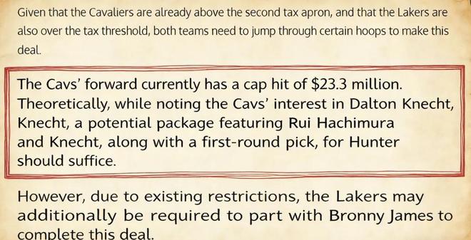湖人对亨特的兴趣由来已久,早在几个月前,NBA记者Chris Haynes就曾有过相关报道,但不知因为何故,交易迟迟没有进展;而来自美媒ClutchPoints记者Brett Siegel的最新报道则显示,骑士展现出对湖人前锋克内克特的兴趣,并提出了一套潜在的交易方案——