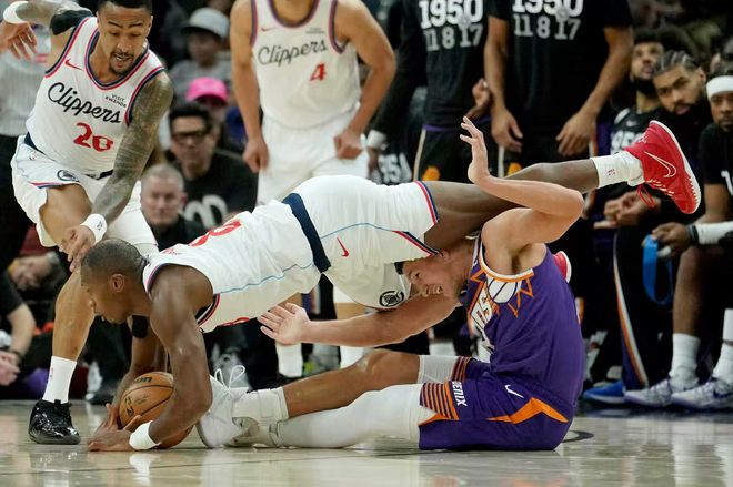 快船与太阳此役都不是全阵容,快船缺少了哈登,太阳缺少了布克、格林,开场两队的进攻效率都不高,整个上半场都是拼防守快船也只领先6分,转折点是在第三节,太阳在第三节崩盘了(有点湖人三节崩的意思),第三节太阳28-36直接被拉开分差。