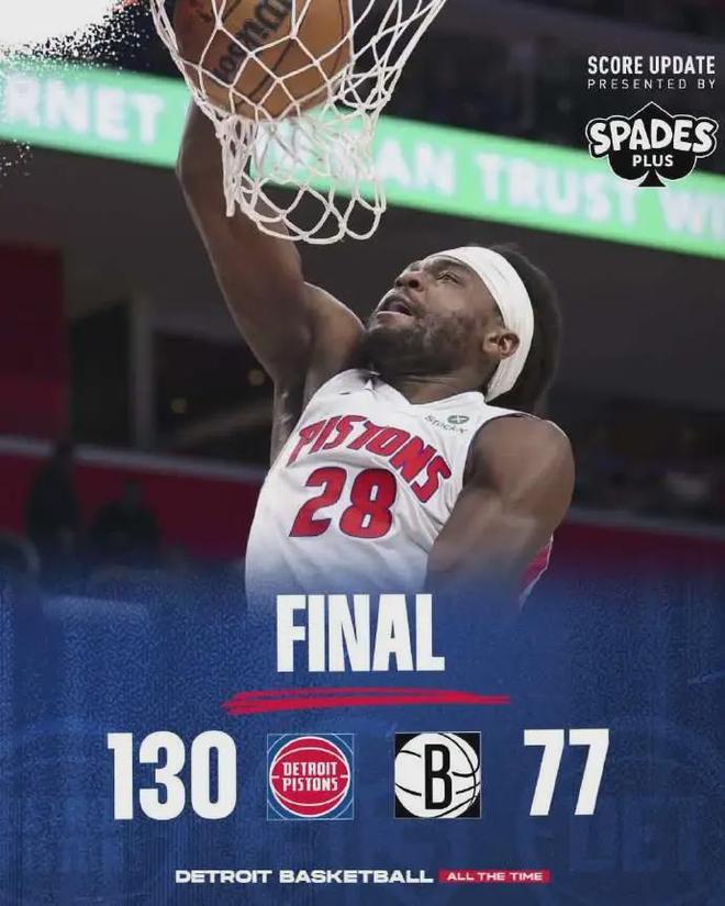 此役活塞赢了53分之多,创造队史单场最大赢球分差。