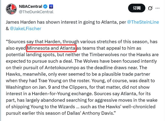 消息源透露,本赛季多个阶段里,哈登都将森林狼与老鹰视为心仪的潜在下家,但森林狼与老鹰两队预计都不会推进相关交易