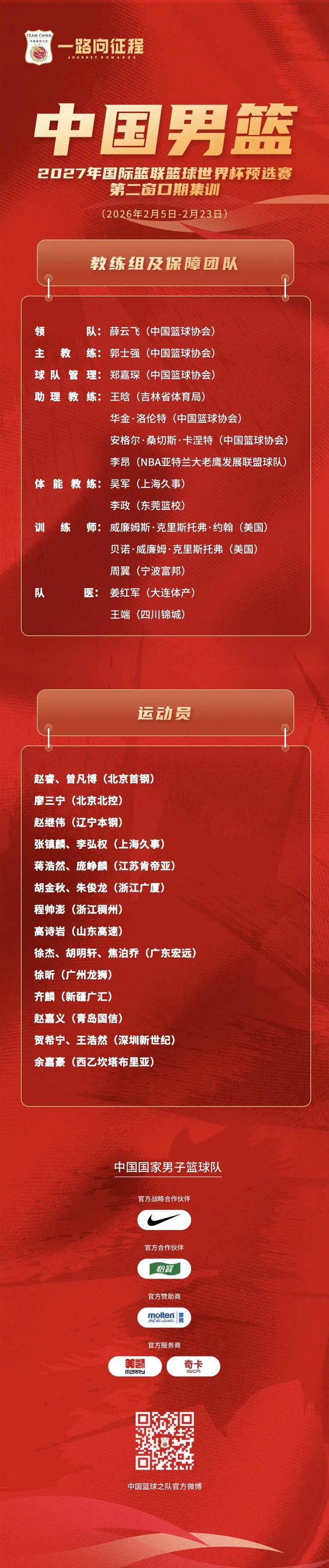 2月3日,中国篮球协会公布了备战国际篮联2027篮球世界杯预选赛第二窗口期的国家队集训大名单,我俱乐部运动员廖三宁再次入选!