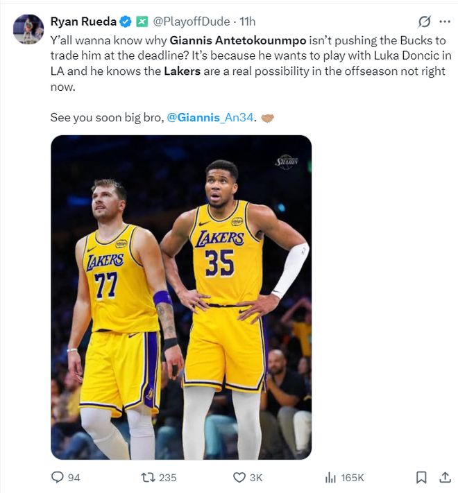 根据湖人记者Ryan Rueda的说法,雄鹿队没有在交易截止日前送扬尼斯的原因之一就是,字母哥希望在今夏与东契奇并肩作战,而且他知道湖人在休赛期开出的筹码会比交易截止日更好,也能帮助雄鹿队。