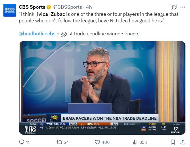根据CBS的播客节目,他们认为在今年交易截止日步行者是最大赢家,祖巴茨是联盟中仅有3-4人最被低估的球星之一。(祖巴茨的年薪才1000多万,性价比极高)