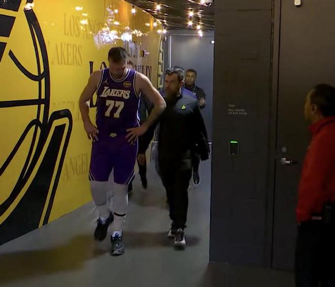 在比赛进行到第二节时刻,东契奇在一次进攻回合后,他出现受伤情况捂着左腿,湖人请求暂停,随后东契奇被替换下场,也是很快返回更衣室去接受检查。