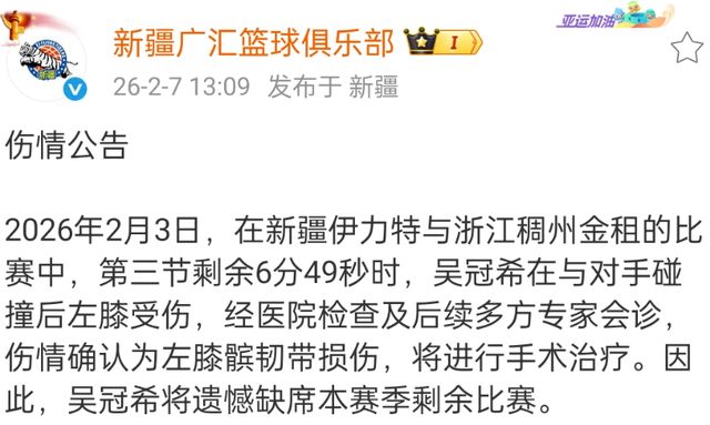 新疆男篮目前只排名第15的位置,格兰取代刘炜之后,成绩也没有明显反弹,然而就在窗口期刚开始,新疆男篮就官方宣布内线大将吴冠希由于膝盖伤病赛季报销,这对于他们影响不小,有可能会补充大外援。
