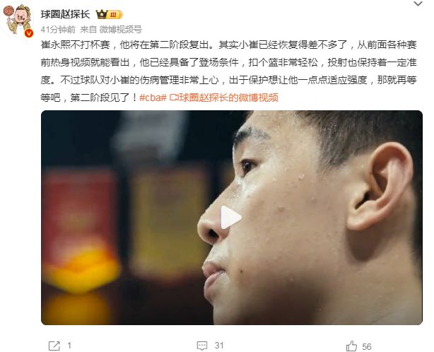 如今根据球圈赵探长报道:“崔永熙不打杯赛,他将在第二阶段复出。其实小崔已经恢复得差不多,从前面各种赛前热身视频就能看出,他已经具备登场条件,扣个篮非常轻松,投射也保持着一定准度。”