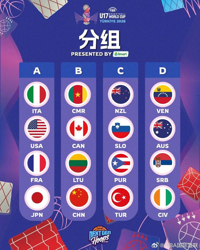 近日,2026FIBAU17世界杯抽签结果出炉,中国队和 立陶宛队、加拿大队、喀麦隆队分在B组,此前相同班底获得U16亚洲杯亚军。