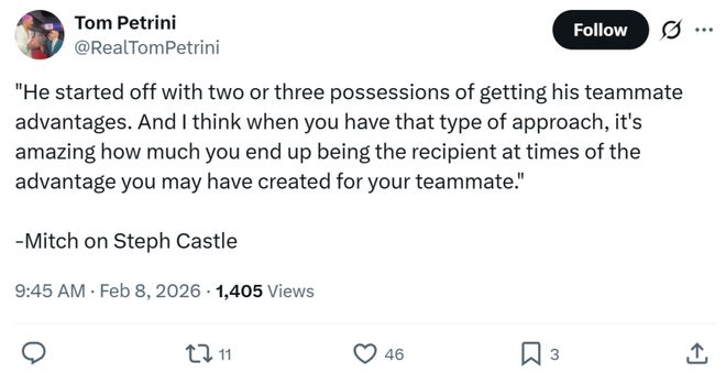 主帅米奇同样称赞了卡斯尔本场合理的打法:“开局前几个回合他一直为队友创造机会,我觉得当你一直采取这种打法时,就会惊讶的发现,你反而会成为自己为队友创造的优势的受益者。”