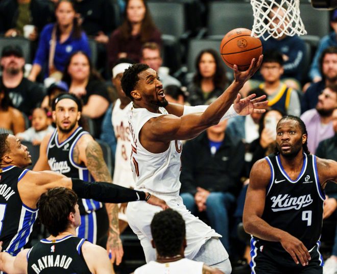后半段米切尔带着替补逐渐缩小分差,托布手感火热,第一节骑士25-31落后,哈登只有助攻。进入第二节,汤姆林暴扣+埃利斯三分,米切尔和施罗德也轮流单打,国王进攻全面哑火,埃利斯手感火热,骑士打出15-2拉开分差。中段哈登回来,德罗赞和威少继续上分,阿伦和泰森回应。威少命中三分后,哈登标志性的撤步三分终于来了,此后阿伦暴扣+造犯规,但节末国王角色球员多点开花,半场骑士57-55领先。哈登半场3分4助,正负值-14;威少13分4助。进入下半场,哈登和米切尔轮流带动阿伦吃饼暴扣,但国王手感也很好。