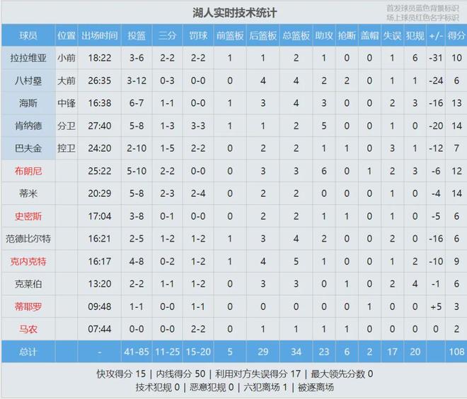 湖人首发:科比-巴夫金、肯纳德、拉拉维亚、八村塁、海斯。马刺首发:福克斯、卡斯尔、尚帕尼、瓦塞尔、文班亚马。湖人把最后一份正式合同给了科比-巴夫金,本赛季他主要在发展联盟征战,场均得到24.7分4.4板3.6助2.6失误。