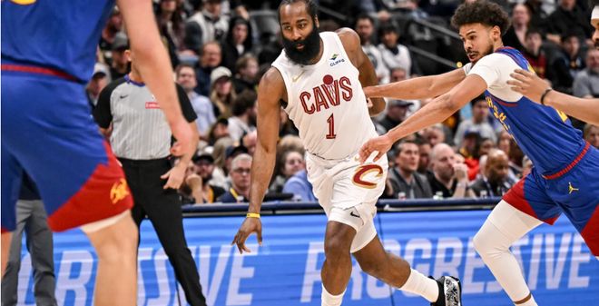 上半场哈登用突破抛射对付约基奇和瓦兰休纳斯,凑合管用;骑士继续哈登+加雷特·阿伦一组,米球+施罗德一组打。第四节初,米球组落后11分,哈登组上来。