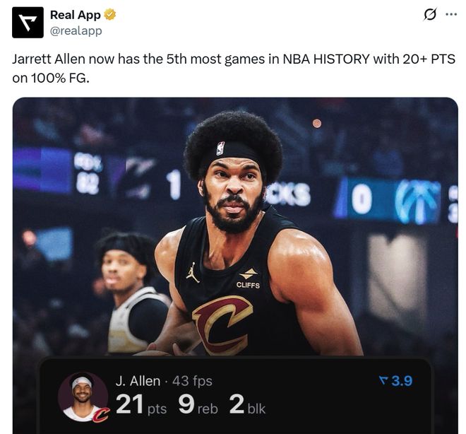 本场艾伦8中8,百分百命中率轰下21分9板1助2盖帽,正负值+25全场最高,这是艾伦生涯第4次以100%命中率轰下20+,成功升至NBA历史第5,仅次于贝尔(10次)、张伯伦(9次)、霍华德(7次)和吉尔摩尔(6次)。