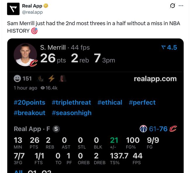 本场梅里尔大发神威,全场12中11,三分10中9,狂砍生涯新高的32分,外加4板1助1断1帽。