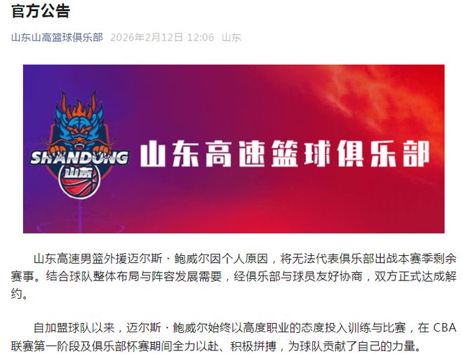 山东男篮官方公告宣布双方友好解约,具体内容如下:
