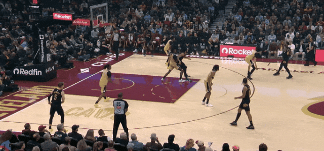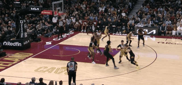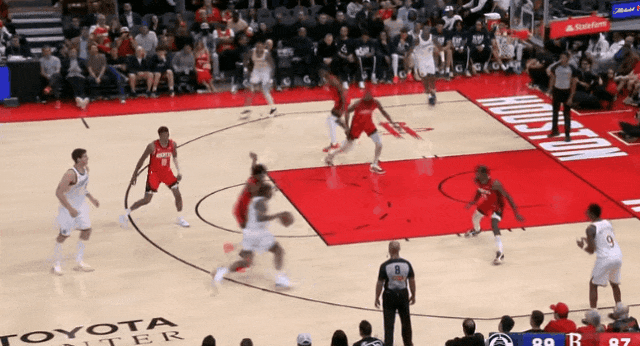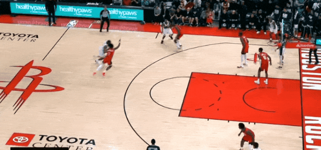 哈登和加雷特二人转后,喂梅里尔远射。上半场末尾,梅里尔快下接传球,和跟进的哈登一个二人传接,远射。
