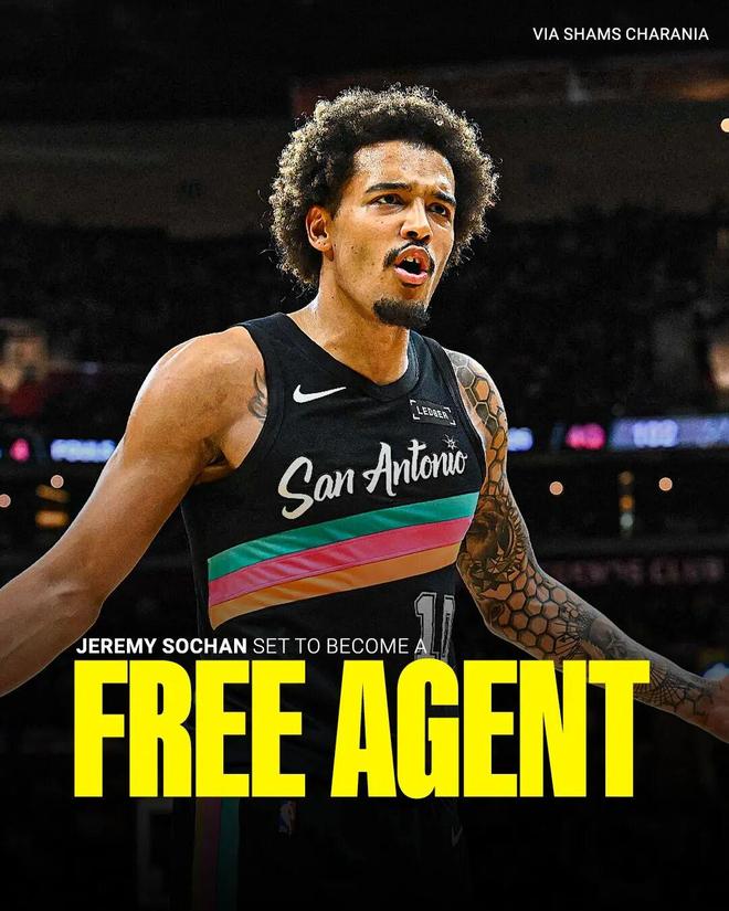 来自名记Shams的最新报道,马刺已经与前锋杰里米索汉达成解约,后者将成为自由球员,预计他会在多支对自己感兴趣的球队里作出选择。