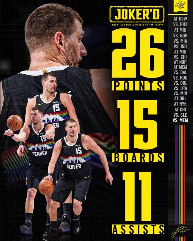 掘金一度领先灰熊15分但在末节两次被残阵灰熊缩小到1分,好在约基奇决胜时刻完成1攻1防,最终约基奇拿到26分15篮板11助攻完成生涯第184次三双,掘金再度回到西部第三。