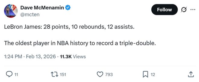 41岁詹姆斯无疑是本场湖人队拿下胜利的最大功臣,全场出战35分钟,20中10,三分7中2,拿下28分10板12助1盖帽三双数据,一口气创造数项NBA历史之最。