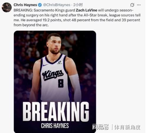 据NBA知名记者Haynes报道,国王队球星扎克·拉文计划于全明星赛结束后接受右手手术,目前已确定将缺席本赛季剩余所有赛事,正式宣告赛季报销。
