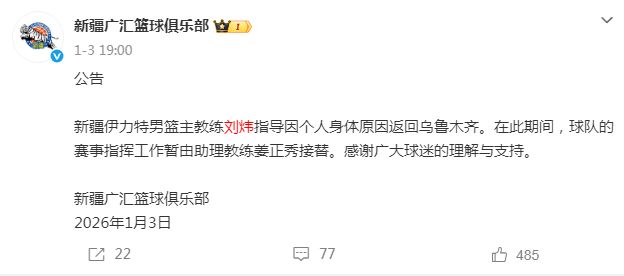 新疆伊力特男篮主教练刘炜指导因个人身体原因返回乌鲁木齐。在此期间,球队的赛事指挥工作暂由助理教练姜正秀接替,感谢广大球迷的理解与支持。