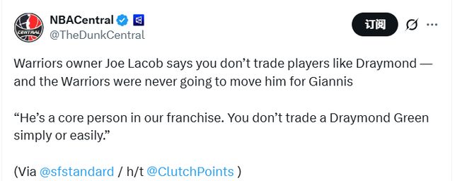北京时间2月21日,勇士队老板乔-拉科布成为球队最新一位公开否认格林曾被放入字母哥交易谈判的高管。在接受勇士记者Tim Kawakami采访时,拉科布呼应了总经理迈克-邓利维此前的说法,称格林从未被纳入任何交易讨论。
