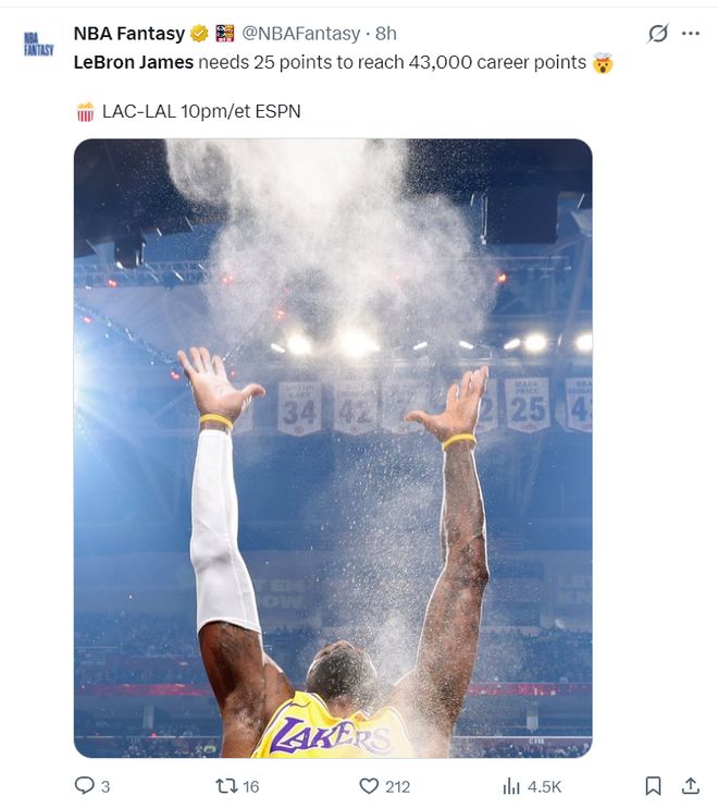半场打完美记Jake Hurricane写道:人们居然在用41岁的勒布朗与28岁的勒布朗作比较,这让我忍俊不禁。在体育史上没有哪一位运动员受过如此之高的期望,单凭这一点足以说明他是历史最伟大的球员。