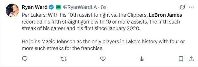 此役詹姆斯完成连续5场比赛10+助攻生涯第五次,也是自2020年1月份后首次,更是与魔术师并列湖人队史仅有两位至少4次连续五场助攻上双的球员。
