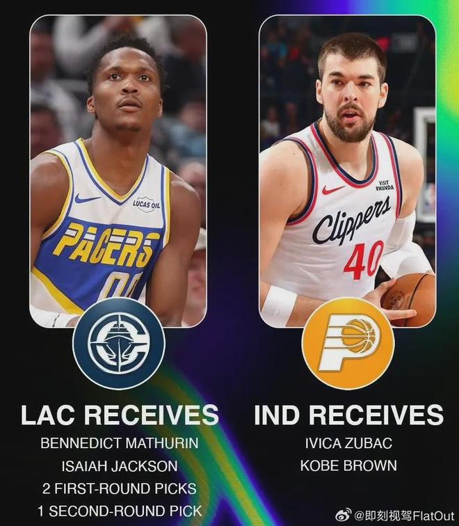 今年交易截止日前,快船送出祖巴茨+科比-布朗,从步行者换来的马瑟林+以赛亚-杰克逊+2个首轮签+1个次轮签。