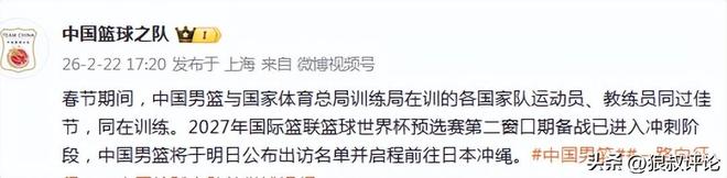 春节期间,中国男篮与国家体育总局训练局在训的各国家队运动员、教练员同过佳节,同在训练。2027年国际篮联篮球世界杯预选赛第二窗口期备战已进入冲刺阶段,中国男篮将于明日公布出访名单并启程前往日本冲绳。