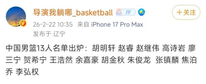 中国男篮国家队已经集训了一段时间,甚至春节期间都没有放假。按照赛程安排,中国男篮将会在26日在客场对阵日本男篮,这场比赛对中国男篮来说非常重要,球队将会于23日出发从上海直飞冲绳,备战这场比赛。媒体人“导演我躺哪儿”透露了出战这个窗口期世预赛的球员名单,总共有13人入选,分别是:胡明轩、赵睿、赵继伟、高诗岩、廖三宁、贺西宁、王浩然、余嘉豪、胡金秋、朱俊龙、张镇麟、焦伯乔和李弘权。