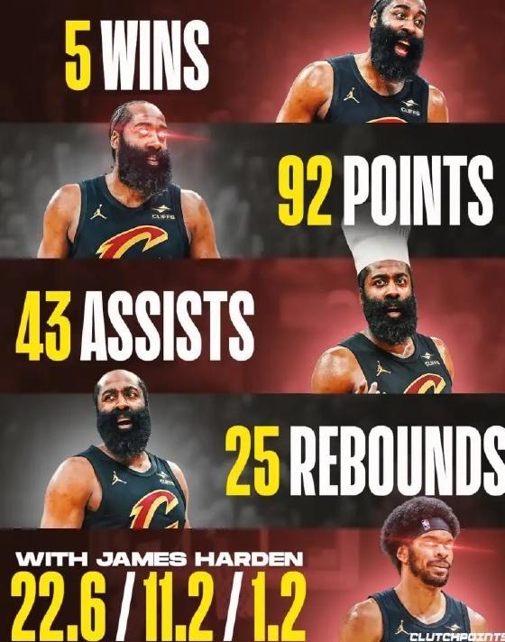 ClutchPoints认为哈登就是骑士急需的精英级指挥官,在最近五场比赛中,哈登贡献18.4分5篮板和8.6助攻,投篮命中率为49.1%,三分球命中率48.1%!