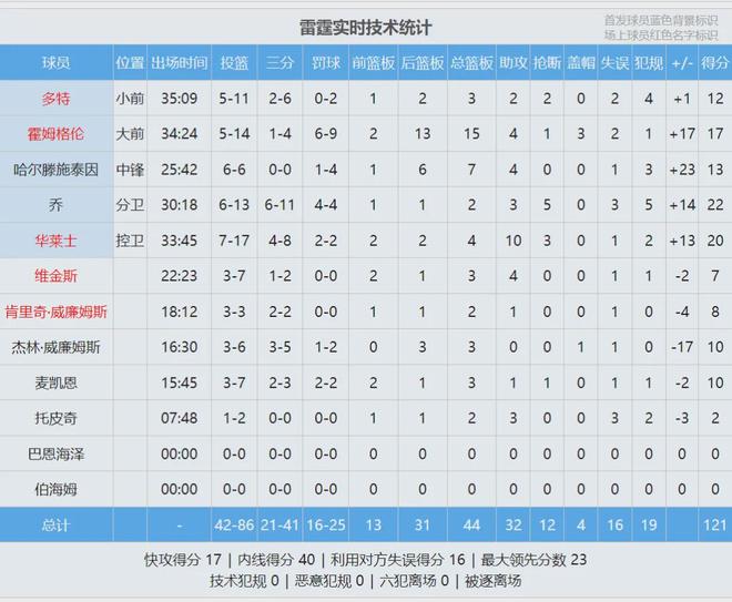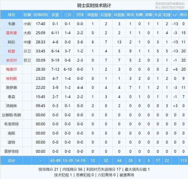 雷霆全队三分球41中21,三分命中率高达51.2%,骑士三分球39中13,三分命中率33.3%。本场比赛四节比分如下(骑士在前):25-40、30-24、31-25、27-32。这是哈登骑士生涯的第一场失利,此前他在骑士的战绩是5胜0负。