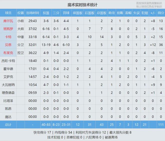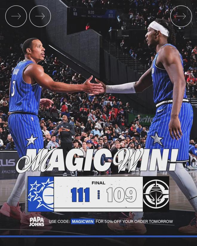 魔术暂停,前场边线球,尼德豪泽这次成功扇飞贝恩的上篮。快船手握绝杀机会,不过泰伦卢并未叫暂停,最后2秒钟,小卡被夹击分给马瑟林。机会确实出来了,可惜马瑟林绝杀三分不中。全场结束,魔术111-109险胜快船。