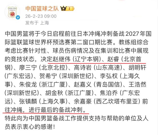 今天上午,中国男篮正式公布了世界杯预选赛第二窗口期的14人大名单,从这份大名单来看,在后场方面,郭士强也是进行了补充,赵继伟、赵睿、廖三宁等人都是名列其中。从赵继伟再一次入选中国男篮大名单,也说明了,郭士强十分看好他的组织串联能力。