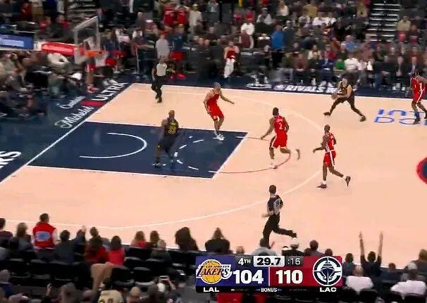 他却把球传给了左侧45°的老詹,在2.8秒的情况下老詹只能仓促出手。